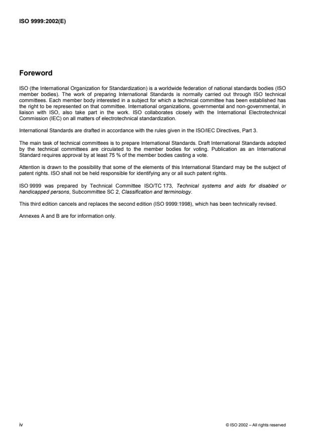 ISO 9999:2002 is a standard published by the International Organization for Standardization (ISO). Its full title is "Technical aids for persons with disabilities — Classification and terminology". This standard covers: Technical aids for persons with disabilities — Classification and terminology