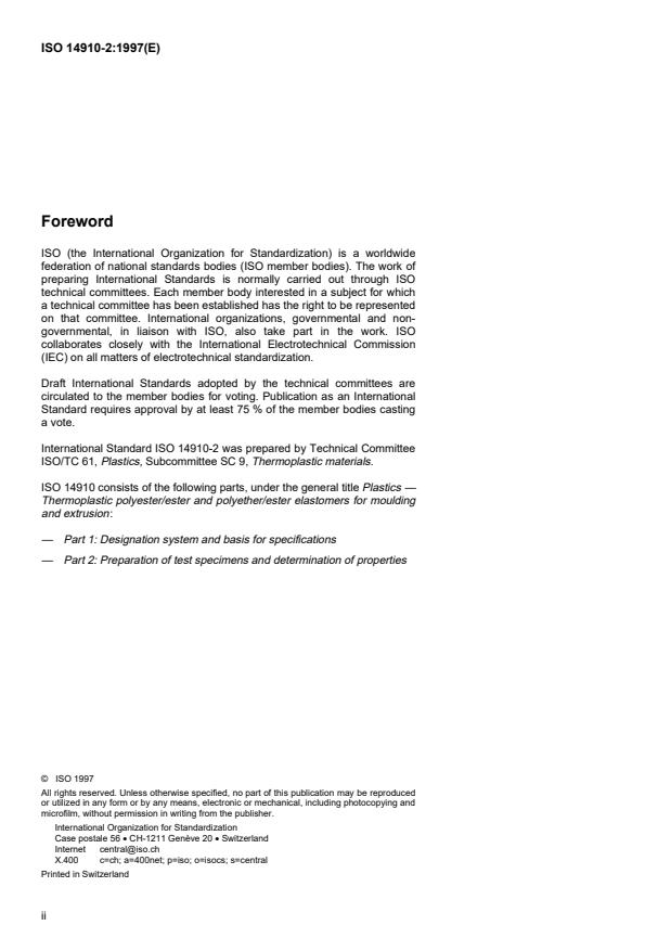 ISO 14910-2:1997 is a standard published by the International Organization for Standardization (ISO). Its full title is "Plastics — Thermoplastic polyester/ester and polyether/ester elastomers for moulding and extrusion — Part 2: Preparation of test specimens and determination of properties". This standard covers: Plastics — Thermoplastic polyester/ester and polyether/ester elastomers for moulding and extrusion — Part 2: Preparation of test specimens and determination of properties