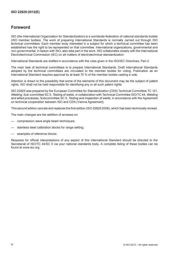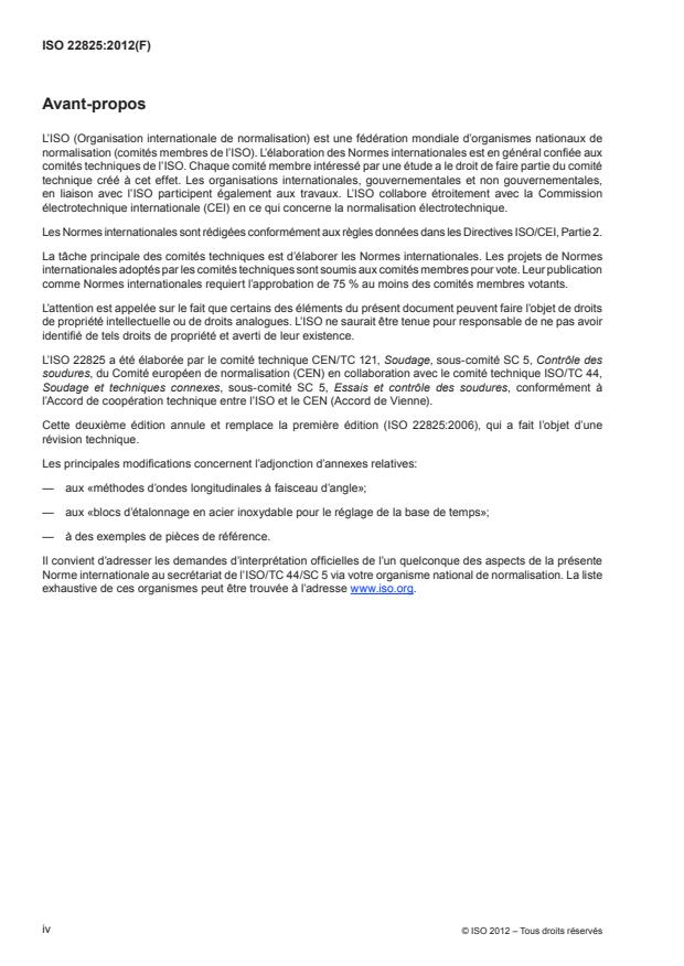 ISO 22825:2012 is a standard published by the International Organization for Standardization (ISO). Its full title is "Non-destructive testing of welds — Ultrasonic testing — Testing of welds in austenitic steels and nickel-based alloys". This standard covers: L'ISO 22825:2012 spécifie l'approche à suivre pour la mise au point des modes opératoires de contrôle par ultrasons des soudures suivantes: a) soudures sur aciers inoxydables; b) soudures sur alliages à base de nickel; c) soudures sur aciers duplex; d) soudures sur métaux dissemblables; e) soudures sur aciers austénitiques. Les objectifs des essais peuvent être très différents, par exemple: 1) évaluation du niveau de qualité (fabrication); 2) détection d'indications spécifiques produites au cours du service. Les niveaux d'acceptation ne sont pas inclus dans l'ISO 22825:2012, mais ils peuvent être appliqués selon le domaine d'application des essais. Les exigences de l'ISO 22825:2012 sont applicables à la fois au contrôle manuel et au contrôle mécanisé.