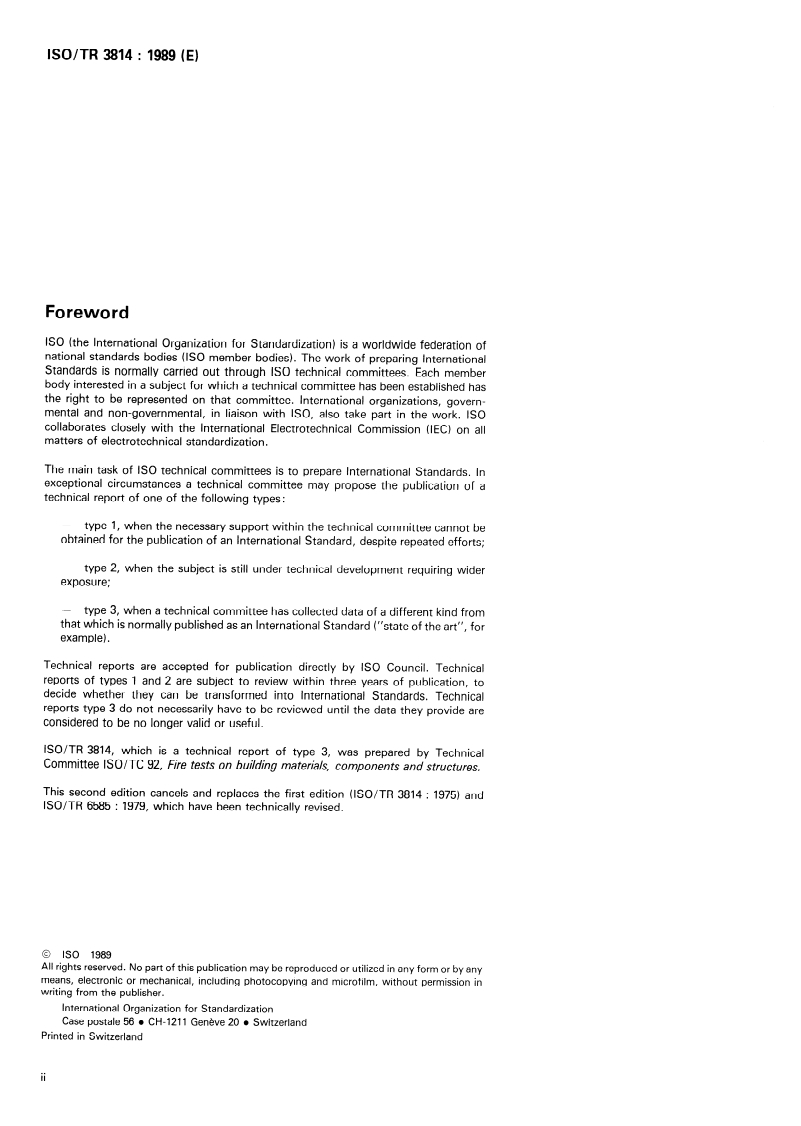 ISO/TR 3814:1989 is a technical report published by the International Organization for Standardization (ISO). Its full title is "Tests for measuring "reaction-to-fire" of building materials — Their development and application". This standard covers: Describes the work carried out by WG 4. Discusses the role and also the limitations of fire tests in reducing fire danger. The research background is briefly summarized and descriptions are given of tests under development for ignitability, spread of flame, and the production of smoke.