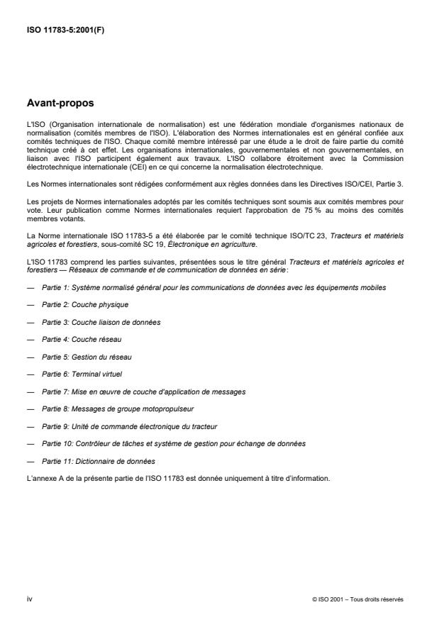 ISO 11783-5:2001 is a standard published by the International Organization for Standardization (ISO). Its full title is "Tractors and machinery for agriculture and forestry — Serial control and communications data network — Part 5: Network management". This standard covers: La présente partie de l'ISO 11783 spécifie un réseau de commande et de communication de données en série pour les tracteurs forestiers ou agricoles et les équipements portés, semi-portés, remorqués ou autotractés. Elle vise à normaliser la méthode et le format du transfert de données entre capteurs, actionneurs, dispositifs de commande, unités de stockage et d'affichage de données, que ces éléments soient montés sur le tracteur ou l'équipement, ou qu'ils en soient un composant. La présente partie de l'ISO 11783 décrit la gestion des adresses sources (AS) pour les unités de commande électroniques (UCE), l'association des adresses à l'identification fonctionnelle d'un dispositif, et à la détection et la signalisation des erreurs liées au réseau. Elle spécifie également des processus d'initialisation, de réaction aux pannes d'électricité de courte durée, et des exigences minimales relatives aux UCE connectées au réseau.