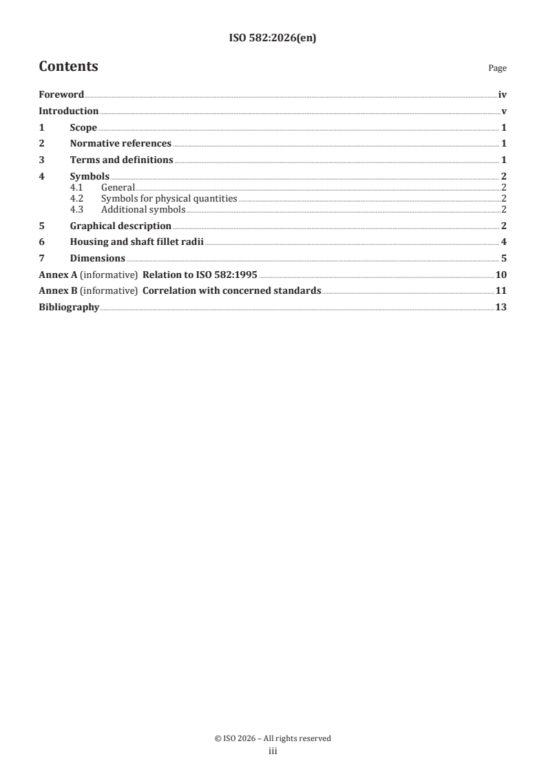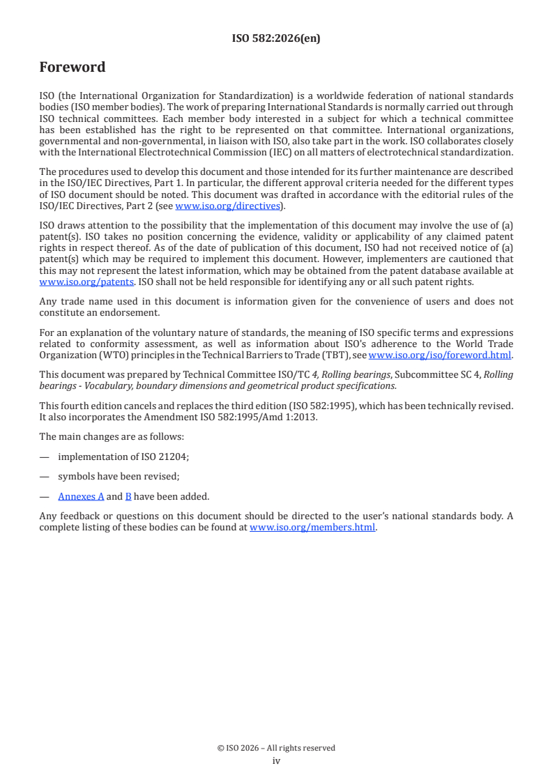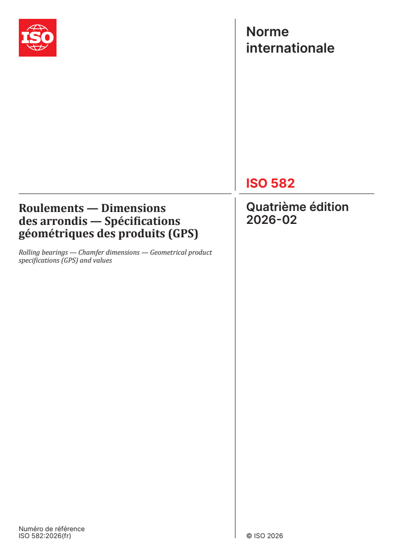 ISO 582:2026 is a standard published by the International Organization for Standardization (ISO). Its full title is "Rolling bearings — Chamfer dimensions — Geometrical product specifications (GPS) and values". This standard covers: This document specifies the chamfer least material boundary for ring and washer chamfers of metric series rolling bearings for the corresponding radius maximum material boundaries. The radius maximum material boundaries are given in references[1],[2],[3],[4],[5],[6],[7]. Recommendations are given for the corresponding housing and shaft fillet radii.