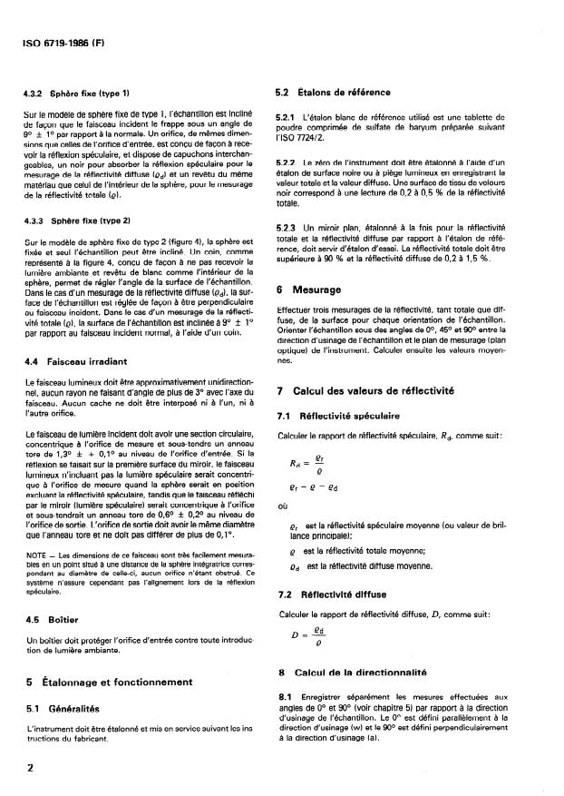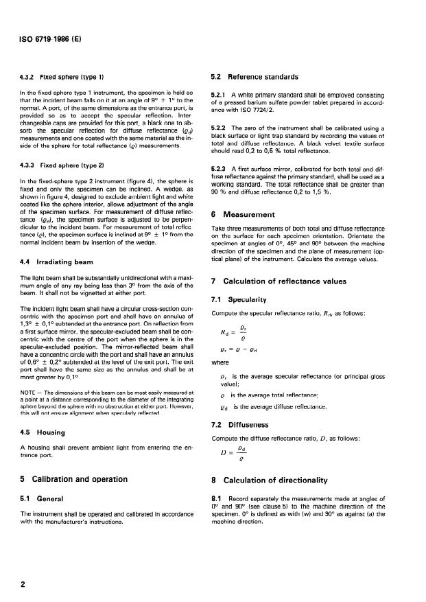 ISO 6719 specifies a method of measuring the total and diffuse luminous reflectance at different angles of incidence. The method is equally applicable to the measurement of specular reflectance (principal gloss value), specularity, and diffuseness.
