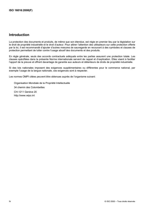 ISO 16016:2000 is a standard published by the International Organization for Standardization (ISO). Its full title is "Technical product documentation — Protection notices for restricting the use of documents and products". This standard covers: La présente Norme internationale spécifie les symboles et clauses de protection destinés à prévenir l'utilisation abusive de documents et produits dont l'usage est réservé. Grâce à l'uniformité de leur texte, ces symboles et clauses attirent l'attention sur l'existence d'un droit de propriété industrielle ou d'un droit d'auteur. En outre, ils indiquent clairement que le détenteur des droits prétend utiliser cette protection juridique dans son intégralité et, en plus, ils limitent toute exploitation desdits documents ou produits.