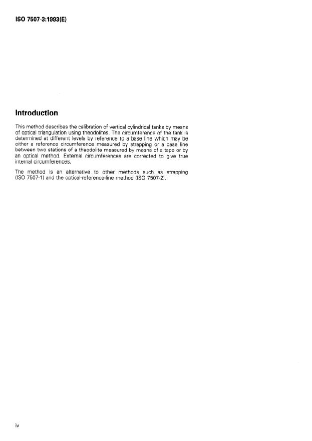 ISO 7507-3:1993 is a standard published by the International Organization for Standardization (ISO). Its full title is "Petroleum and liquid petroleum products — Calibration of vertical cylindrical tanks — Part 3: Optical-triangulation method". This standard covers: Applies to tanks above 8 m in diameter with cylindrical courses that are substantially vertical. Provides a method for determining the volumetric quantity contained within a tank at gauged liquid levels by optical triangulation using theodolites and laser beams. The measurement required to determine the radius may be made internally or externally. The external method is applicable only to tanks that are free of insulation. For tilted tanks with a deviation of up to 3 % from the vertical a correction as described in ISO 7507-1 may be applied.