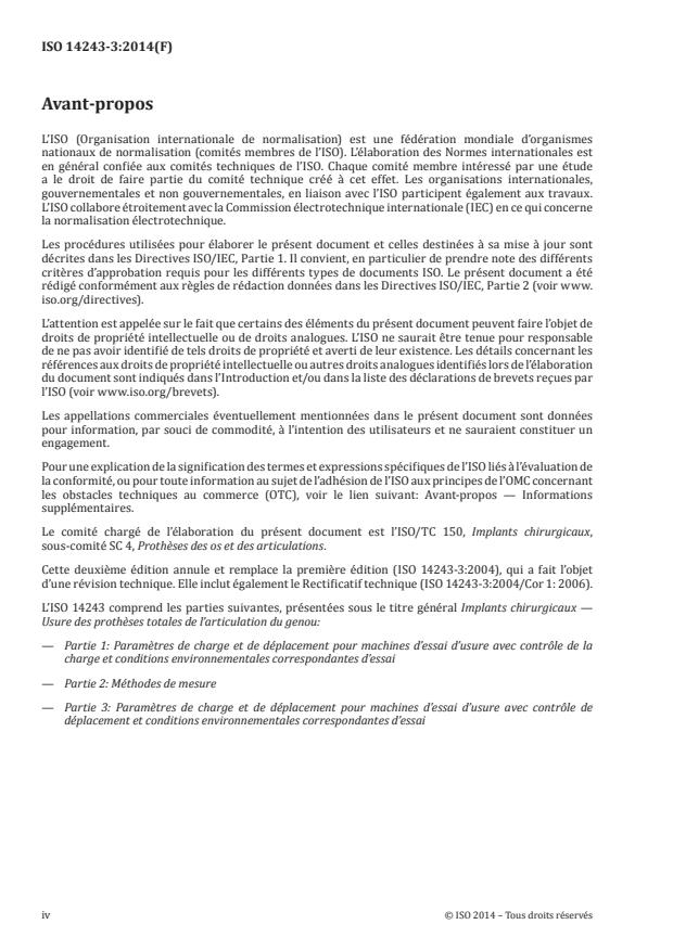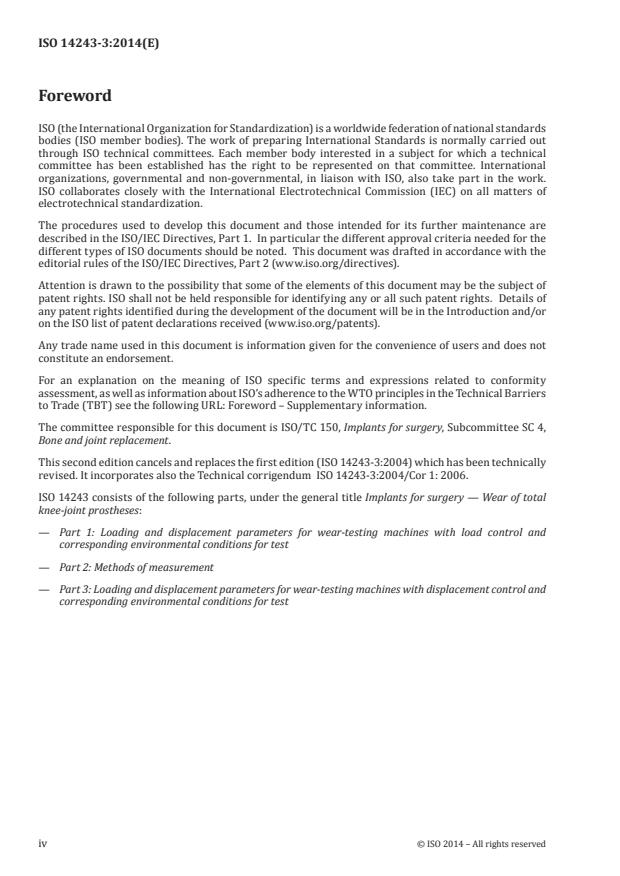 ISO 14243-3:2014 is a standard published by the International Organization for Standardization (ISO). Its full title is "Implants for surgery — Wear of total knee-joint prostheses — Part 3: Loading and displacement parameters for wear-testing machines with displacement control and corresponding environmental conditions for test". This standard covers: ISO 14243-3:2014 describes a test method that specifies flexion/extension relative angular movement between articulating components, the pattern of the applied force, speed and duration of testing, sample configuration and test environment to be used for the wear testing of total knee-joint prostheses in wear-testing machines having axial load control, flexion/extension angular motion control, AP displacement control and tibial rotation control. The kinematics of this part of ISO 14243-3:2014 may not be applicable to knee designs with a high degree of constraint, which could result in damage to the articulating components in the early stages of the test that would not be representative of clinical service.