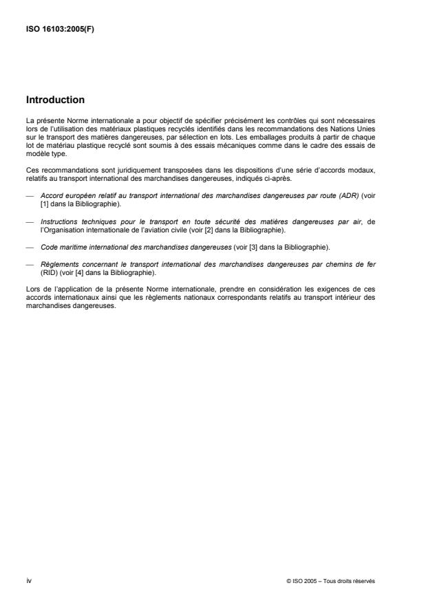 L'ISO 16103:2005 spécifie les exigences et les méthodes d'essai relatives à la production des matériaux en plastique recyclé destinés à être utilisés dans les emballages pour le transport des marchandises dangereuses. Elle inclut un guide pour le programme d'assurance de la qualité.