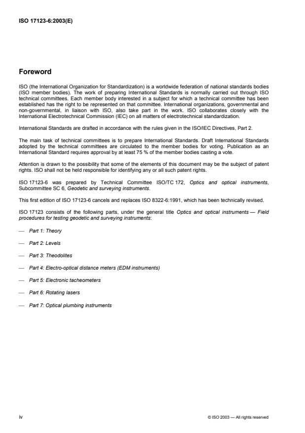 ISO 17123-6:2003 is a standard published by the International Organization for Standardization (ISO). Its full title is "Optics and optical instruments — Field procedures for testing geodetic and surveying instruments — Part 6: Rotating lasers". This standard covers: ISO 17123-6:2003 specifies field procedures to be adopted when determining and evaluating the precision (repeatability) of rotating lasers and their ancillary equipment when used in building and surveying measurements for levelling tasks. Primarily, these tests are intended to be field verifications of the suitability of a particular instrument for the immediate task at hand and to satisfy the requirements of other standards. They are not proposed as tests for acceptance or performance evaluations that are more comprehensive in nature. These field procedures have been developed specifically for in situ applications without the need for special ancillary equipment and are purposefully designed to minimize atmospheric influences.