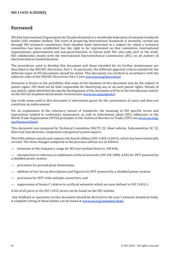 ISO 11452-4:2020 is a standard published by the International Organization for Standardization (ISO). Its full title is "Road vehicles — Component test methods for electrical disturbances from narrowband radiated electromagnetic energy — Part 4: Harness excitation methods". This standard covers: This document specifies harness excitation test methods and procedures for determining the immunity of electronic components of passenger cars and commercial vehicles regardless of the propulsion system (e.g. spark-ignition engine, diesel engine, electric motor). The bulk current injection (BCI) test method is based on current injection into the wiring harness using a current probe as a transformer where the harness forms the secondary winding. The tubular wave coupler (TWC) test method is based on a wave coupling into the wiring harness using the directional coupler principle. The TWC test method was developed for immunity testing of automotive components with respect to radiated disturbances in the GHz ranges (GSM bands, UMTS, ISM 2,4 GHz). It is best suited to small (with respect to wavelength) and shielded device under test (DUT), since in these cases the dominating coupling mechanism is via the harness. The electromagnetic disturbances considered in this document are limited to continuous narrowband electromagnetic fields.