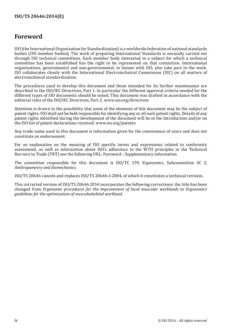 ISO/TS 20646:2014 is a technical specification published by the International Organization for Standardization (ISO). Its full title is "Ergonomics guidelines for the optimization of musculoskeletal workload". This standard covers: ISO/TS 20646:2014 provides information and guidelines to properly utilize various ergonomics standards concerning the factors related to musculoskeletal workload (MSWL), and helps develop activities to reduce or optimize MSWL in workplaces and non-professional activities, in an effective and efficient manner. The activities are intended to be based on a risk assessment. ISO/TS 20646:2014 is intended primarily for employers, ergonomics and occupational health-related staff and workers in enterprises, and workers. Prevention of MSWL is not always a matter of reducing the load. The approach to reducing MSWL also involves assessing the work environment and organization as a system to identify how changes can help to safely manage MSWL. Although it provides ideas of effective and efficient measures to reduce or optimize MSWL, ISO/TS 20646:2014 does not certify the complete prevention of health problems caused by MSWL.