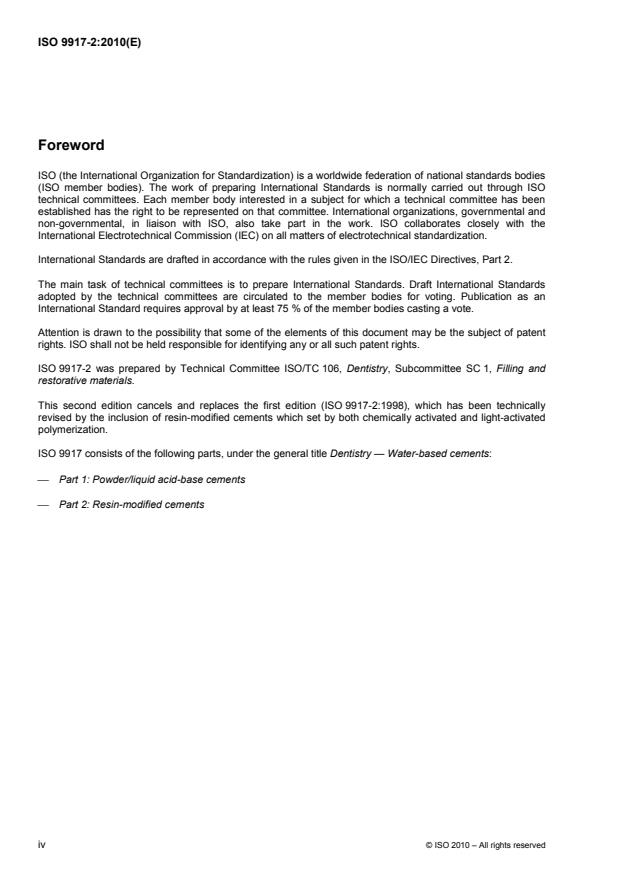 ISO 9917-2:2010 is a standard published by the International Organization for Standardization (ISO). Its full title is "Dentistry — Water-based cements — Part 2: Resin-modified cements". This standard covers: ISO 9917‑2:2010 specifies requirements and test methods for dental cements that are intended for luting, base or lining and restoration purposes and for which the materials are water-based and set by multiple reactions in which setting is achieved by a combination of an acid-base reaction and polymerization.