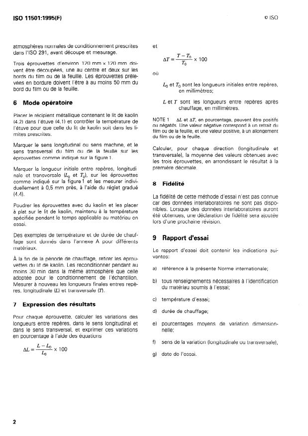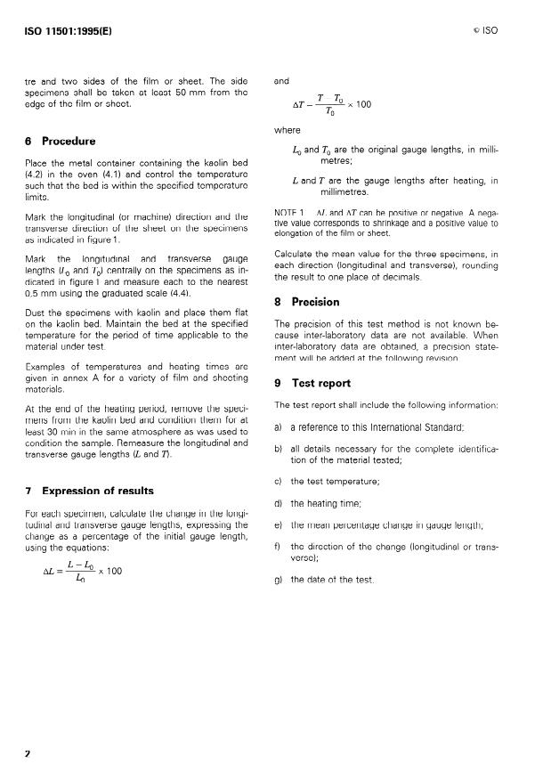 Keywords: ISO 11501:1995, dimensional change, plastics film and sheeting, thermal shrinkage, kaolin bed, circulating-air oven, gauge length, thermoforming test.