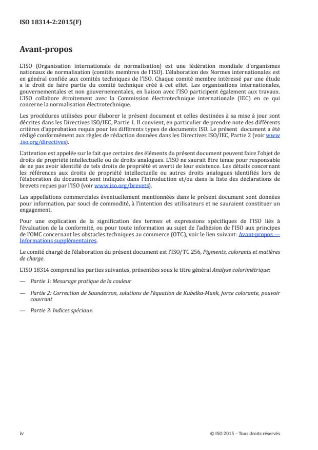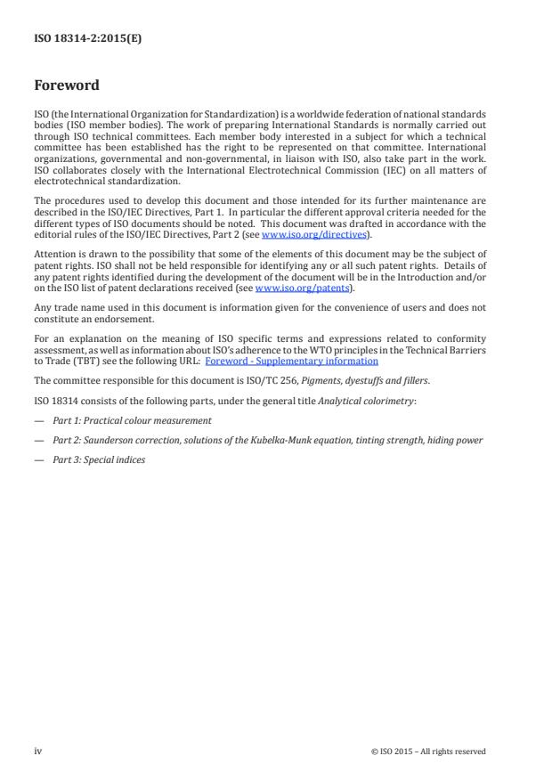 ISO 18314-2:2015 is a standard published by the International Organization for Standardization (ISO). Its full title is "Analytical colorimetry — Part 2: Saunderson correction, solutions of the Kubelka-Munk equation, tinting strength, hiding power". This standard covers: ISO 18314-2:2015 specifies the Saunderson correction for different measurement geometries and the solutions of the Kubelka-Munk equation for hiding and transparent layers. It also specifies methods for the calculations of the tinting strength including the residual colour difference with different criteria and of the hiding power. The procedures for preparing the samples for these measurements are not part of this part of ISO 18314. They are agreed between the contracting parties or are described in other national or International Standards.