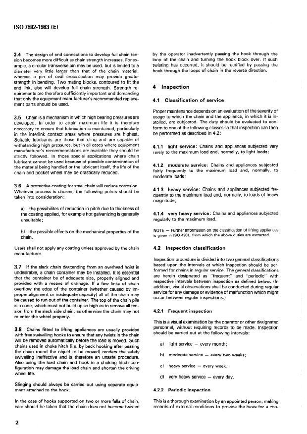 ISO 7592:1983 is a standard published by the International Organization for Standardization (ISO). Its full title is "Calibrated round steel link lifting chains — Guidelines to proper use and maintenance". This standard covers: Specifies the main principles for the use, inspection, in-service testing and maintenance of chains operating over chain wheels. The principal applications include manual and power driven hoists. Lifting chains may be governed by national and local laws and regulations.