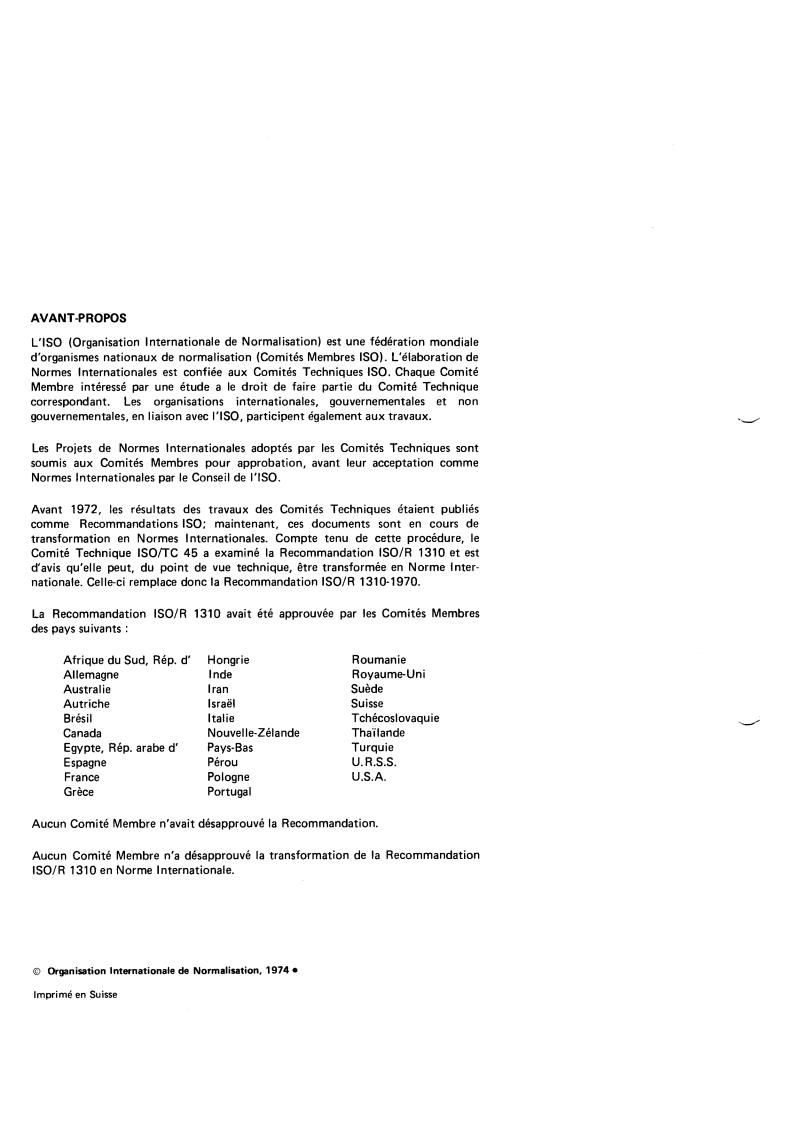 IS0 Recommendation R 1310 was approved by the Member Bodies of the following