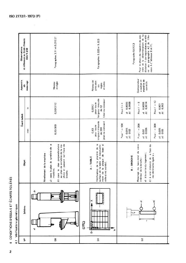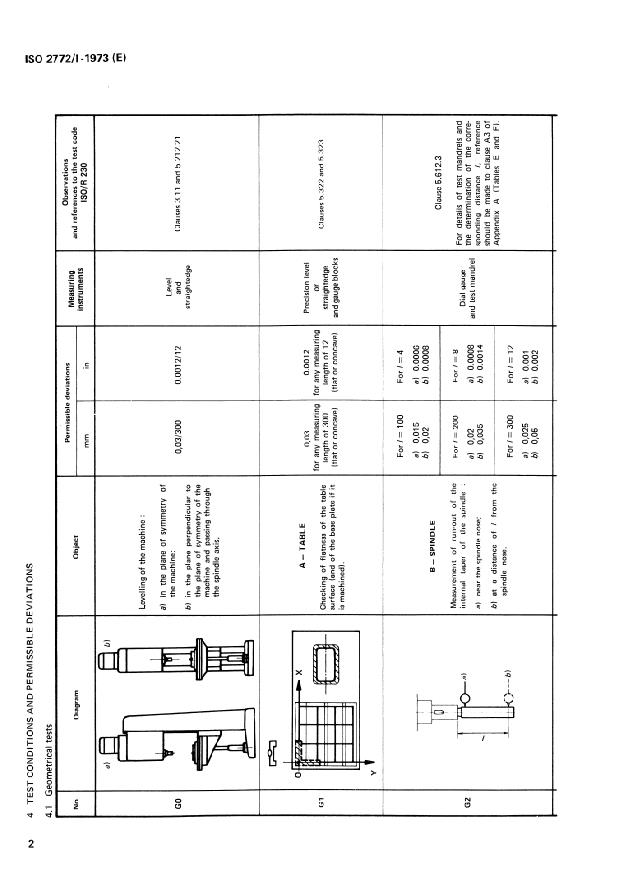 ISO 2772-1:1973 is a standard published by the International Organization for Standardization (ISO). Its full title is "Test conditions for box type vertical drilling machines — Testing of the accuracy — Part 1: Geometrical tests". This standard covers: Specifies both geometrical and practical tests on these general purpose and normal accuracy drilling machines, and gives the corresponding permissible deviations which apply. It deals only with the verification of the accuracy of the machine. It does not apply to the testing of the running of the machine (vibrations, abnormal noises, stick-slip motion of components, etc.), or to characteristics (speeds, feeds, etc.), which shall generally be checked before the accuracy is tested.