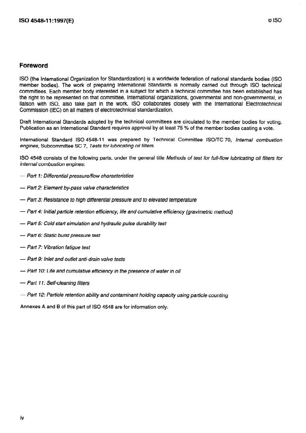 ISO 4548-11:1997 is a standard published by the International Organization for Standardization (ISO). Its full title is "Methods of test for full-flow lubricating oil filters for internal combustion engines — Part 11: Self-cleaning filters". This standard covers: Methods of test for full-flow lubricating oil filters for internal combustion engines — Part 11: Self-cleaning filters