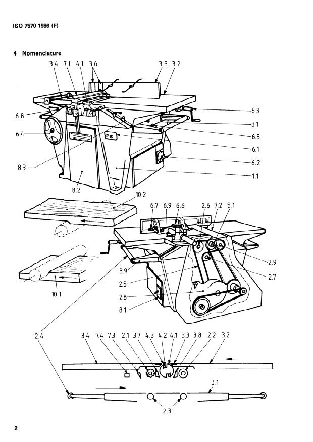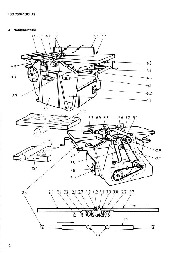 ISO 7570:1986 is a standard published by the International Organization for Standardization (ISO). Its full title is "Woodworking machines — Surface planing and thicknessing machines — Nomenclature and acceptance conditions". This standard covers: Specifies the geometrical tests for these woodworking planing machines, and gives the corresponding permissible deviations which apply to machines for general purpose use and normal accuracy. Gives also the terminologie appropriate to each part of the machine (in English and French as well as the equivalent terms in German, Spanish, Italian and Swedish). It deals only with the verification off accuracy of the machine. It does not apply to the testing of the running of the machine, nor to machine characteristcs which should generally be checked before the accuracy is tested. Does not impose any practical test.