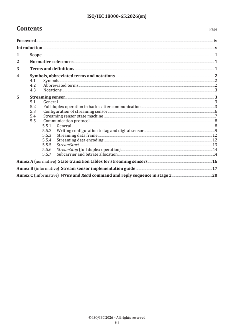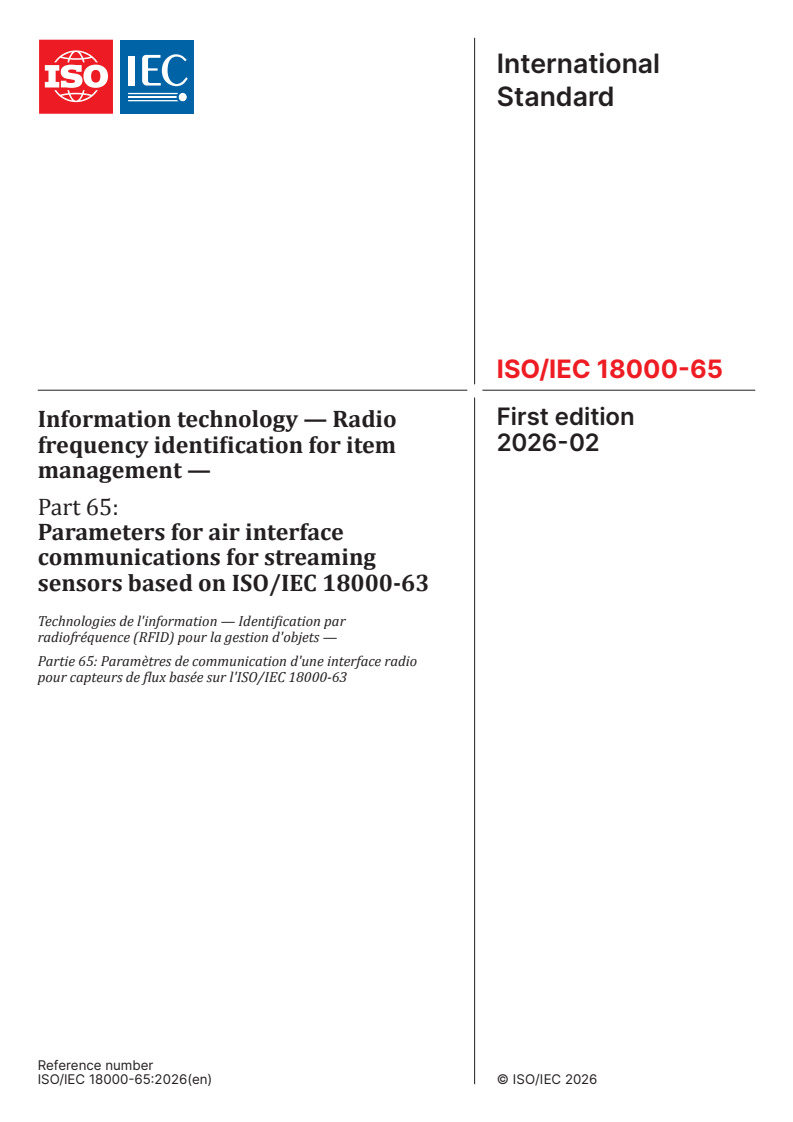 ISO/IEC 18000-65:2026 - Information technology — Radio frequency identification for item management — Part 65: Parameters for air interface communications for streaming sensors based on ISO/IEC 18000-63 Released:2/13/2026