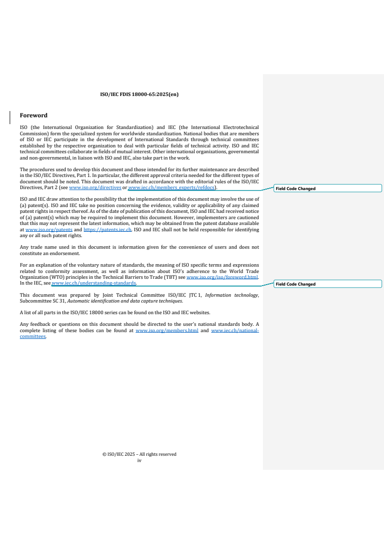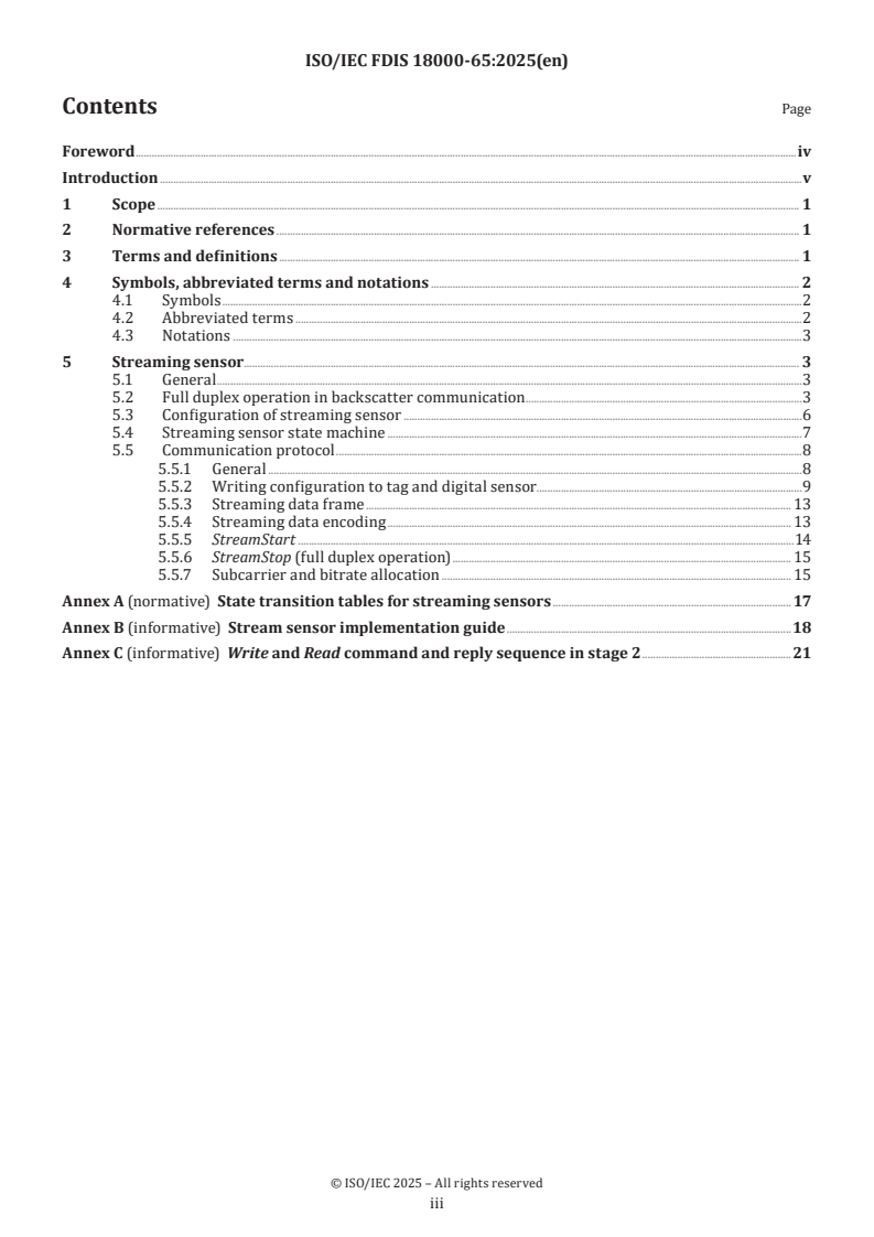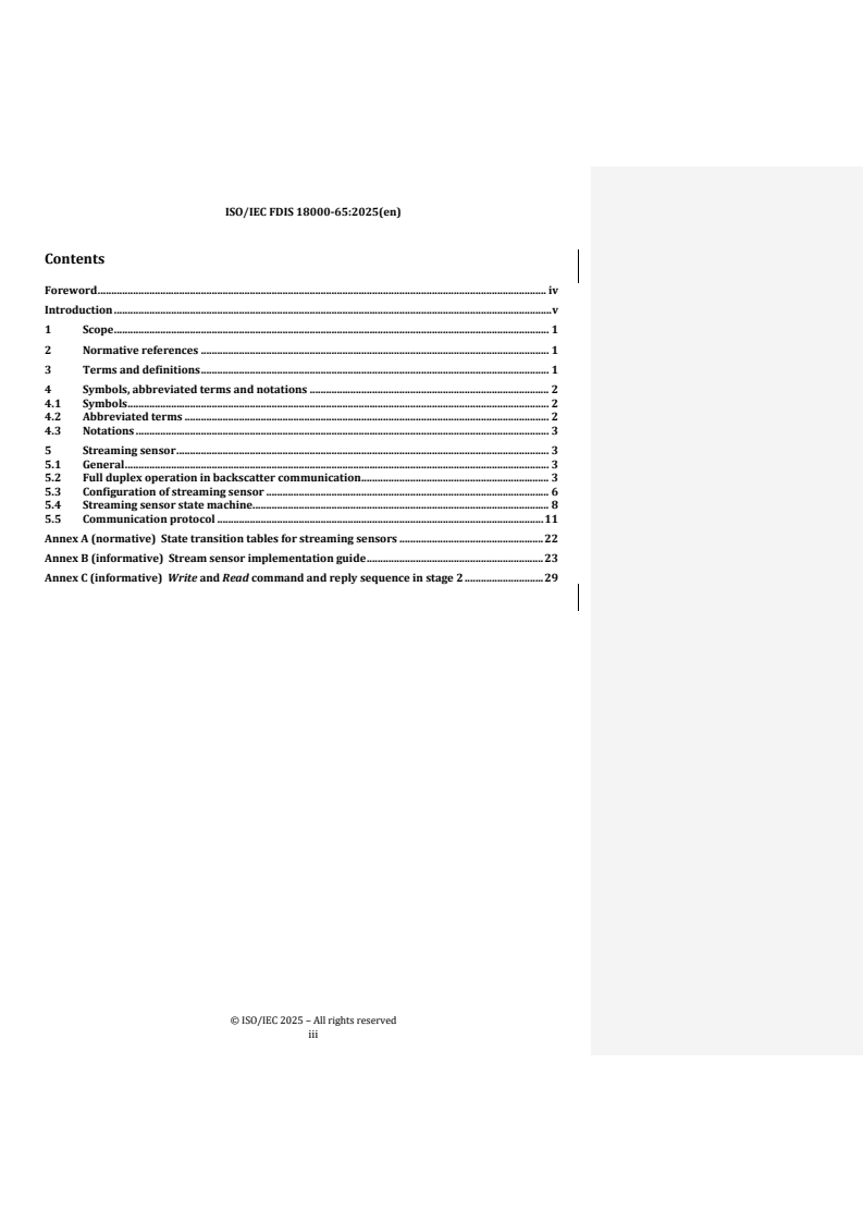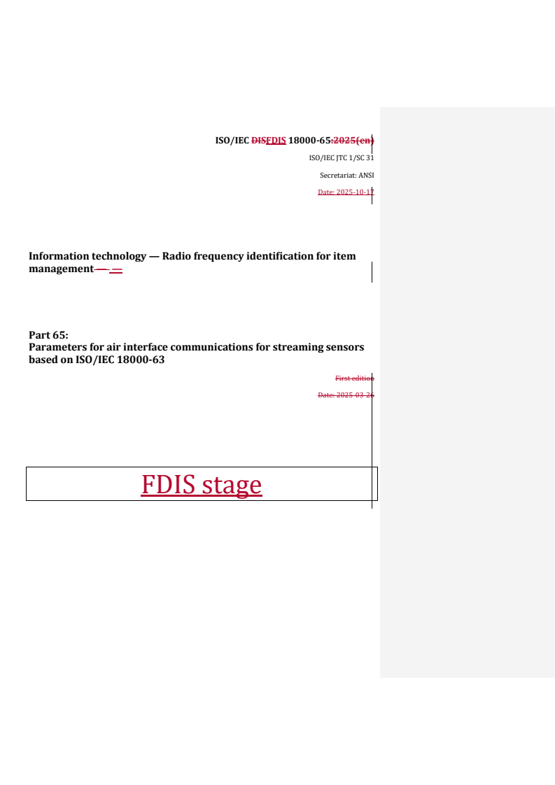 REDLINE ISO/IEC FDIS 18000-65 - Information technology — Radio frequency identification for item management — Part 65: Parameters for air interface communications for streaming sensors based on ISO/IEC 18000-63 Released:10/17/2025