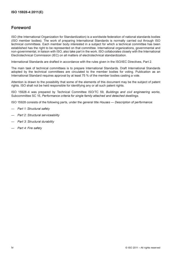 ISO 15928-4:2011 is a standard published by the International Organization for Standardization (ISO). Its full title is "Houses — Description of performance — Part 4: Fire safety". This standard covers: Houses — Description of performance — Part 4: Fire safety