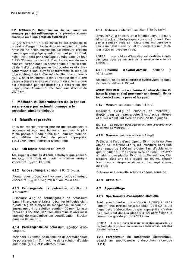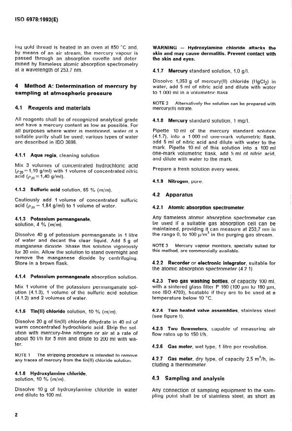ISO 6978:1992 is a standard published by the International Organization for Standardization (ISO). Its full title is "Natural gas — Determination of mercury". This standard covers: Two methods are specified: method A for higher mercury content (> 0,5 µg/m^3) based on sampling at atmospheric pressure, absorption in potassium permangante solution, reduction of mercury ions, analysis by flameless atomic absorption spectrometry; method B for lower mercury content (10^- 3 µg/m^3 to 1 µg/m^3) based on sampling at atmospheric or higher pressure, adsorption on silver/gold, desorption, analysis by flameless atomic absorption spectrometry.