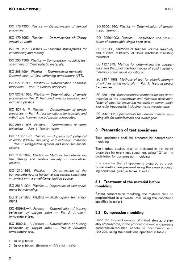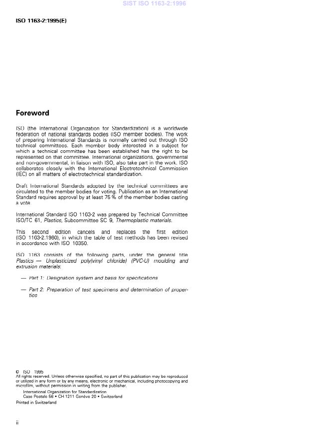 ISO 1163-2:1995 is a standard published by the International Organization for Standardization (ISO). Its full title is "Plastics — Unplasticized poly(vinyl chloride) (PVC-U) moulding and extrusion materials — Part 2: Preparation of test specimens and determination of properties". This standard covers: Specifies procedures and conditions for the preparation of test specimens of PVC-U plastics and methods for measuring their properties, which be strongly influenced by the thermal history and the internal stresses. Cancels and replaces the first edition.