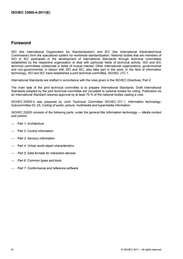 ISO/IEC 23005-4:2011 is a standard published by the International Organization for Standardization (ISO). Its full title is "Information technology — Media context and control — Part 4: Virtual world object characteristics". This standard covers: ISO/IEC 23005-4:2011 provides syntax and semantics of description schemes and descriptors used to characterize a virtual world object related metadata to provide the interoperability between virtual worlds and/or control a virtual world object in a virtual world by real world devices, which are various types of user interaction devices, including sensors. ISO/IEC 23005-4:2011 includes an XML Schema, called Virtual World Object Characteristics XSD, for describing an object by considering three main requirements: it should be possible to easily create importers/exporters from various VE implementations; it should be easy to control an object within a VE; and it should be possible to modify a proprietary template (specific to the virtual world) of the object by using data contained in Virtual World Object Characteristics file. The schema of ISO/IEC 23005-4:2011 deals only with metadata and does not include representations of geometry, sound, scent, animation or texture. To represent the latter, references to media resources are used.