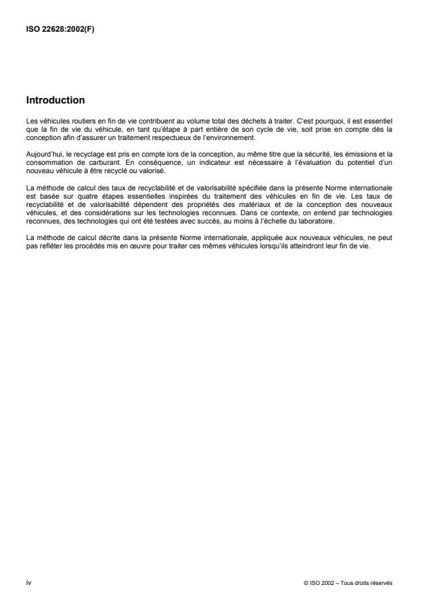 L'ISO 22628 spécifie une méthode de calcul des taux de recyclabilité et de valorisabilité d'un nouveau véhicule routier, exprimés comme une fraction massique de ce véhicule routier. Elle est applicable par le constructeur du véhicule lorsqu'un nouveau véhicule, qui peut, potentiellement, être recyclé, réutilisé ou les deux (taux de recyclabilité), ou valorisé, réutilisé ou les deux (taux de valorisabilité), est mis sur le marché.