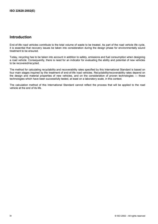 Keywords: ISO 22628, recyclability rate, recoverability rate, road vehicles, calculation method, end‑of‑life vehicles, dismantling, metals separation, non‑metallic residue, vehicle mass.