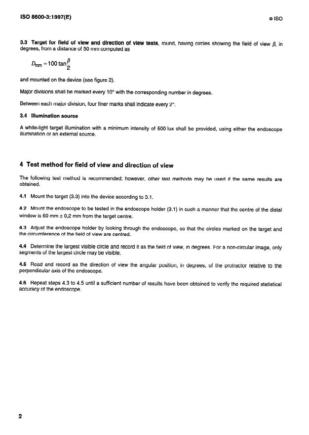 ISO 8600-3:1997 is a standard published by the International Organization for Standardization (ISO). Its full title is "Optics and optical instruments — Medical endoscopes and endoscopic accessories — Part 3: Determination of field of view and direction of view of endoscopes with optics". This standard covers: Optics and optical instruments — Medical endoscopes and endoscopic accessories — Part 3: Determination of field of view and direction of view of endoscopes with optics