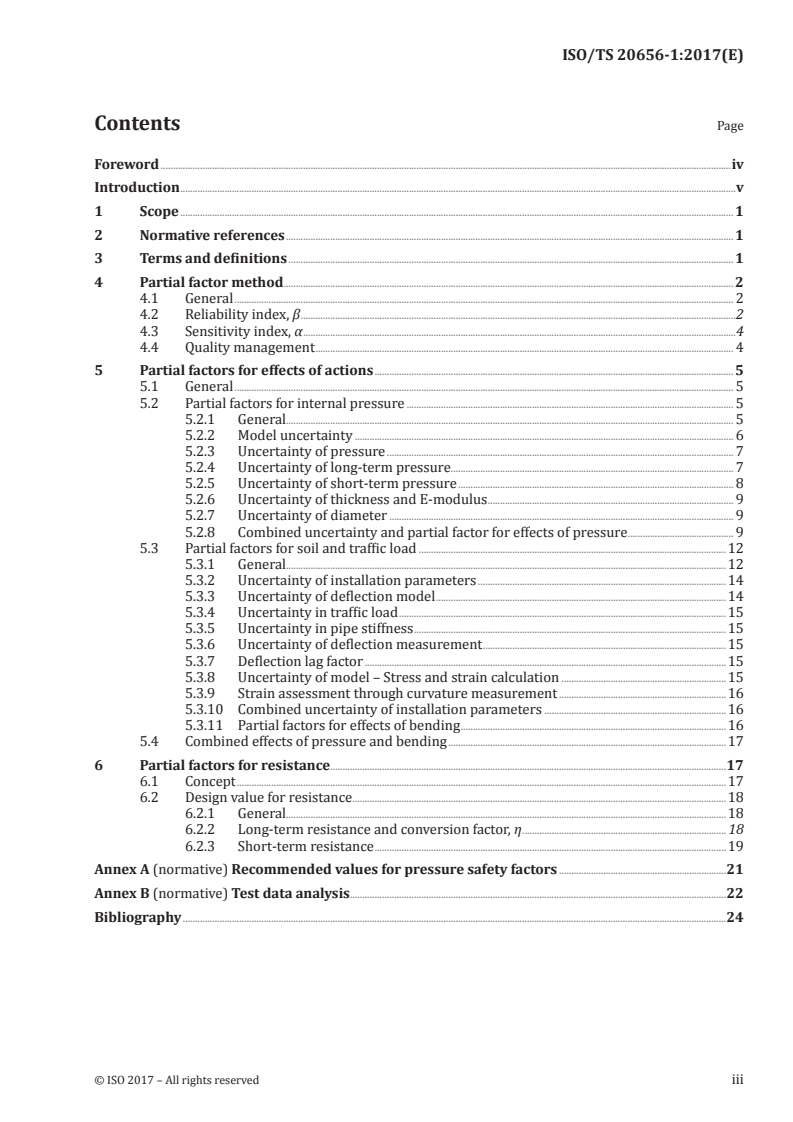 ISO/TS 20656-1:2017 describes how partial factors for buried GRP pipes are developed, and are primarily intended to define the necessary safety measures for GRP pipes that meet the requirements of ISO 10639, ISO 10467 and ISO 25780, and EN 1796 and EN 14364. The same methodology can be utilised for other pipe product standards, although other parameters would apply.