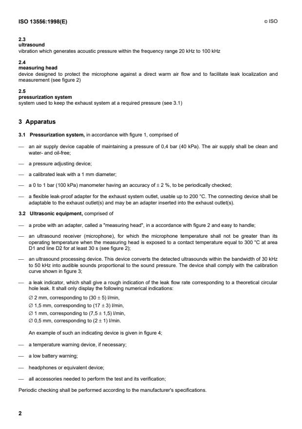 Keywords: ISO 13556, exhaust system leaks, leak localization, ultrasonic detection, pressurization system, leak testing, road vehicles, emission testing, measuring head, calibrated leak.