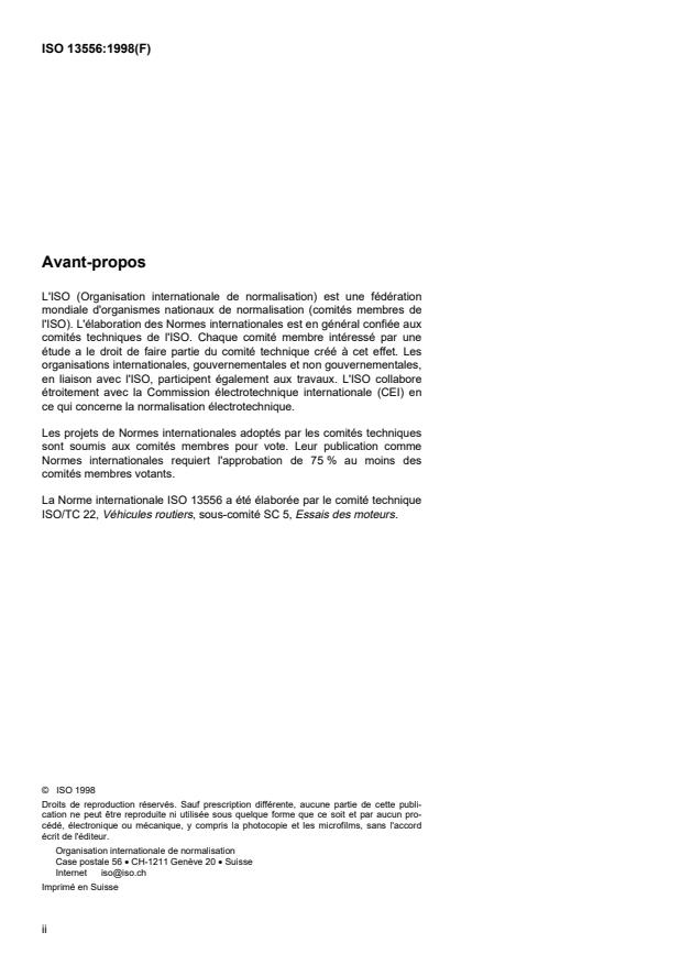 ISO 13556:1998 is a standard published by the International Organization for Standardization (ISO). Its full title is "Road vehicles - Localization of exhaust system leaks and equipment specifications". This standard covers: La présente Norme internationale prescrit une méthode pour vérifier l'étanchéité aux gaz du système d'échappement des véhicules routiers équipés d'un moteur à combustion interne. Elle est essentiellement destinée à établir une méthode de détection et de localisation des fuites des systèmes d'échappement, afin d'améliorer la qualité des mesurages des émissions de gaz d'échappement. Elle est aussi destinée à compléter les exigences de l'ISO 39291) et des réglementations applicables. Les utilisateurs de la présente Norme internationale sont avertis: a) que pour certains moteurs, et plus particulièrement pour des moteurs de huit cylindres et plus, avec un arbre à cames très croisées, les soupapes d'échappement peuvent ne pas être toutes fermées lorsque le moteur est arrêté. Cela peut conduire à l'échec de l'essai de fuite. On peut y remédier en démontant le mécanisme de commande des soupapes conformément aux instructions du constructeur du véhicule ou du moteur; b) qu'il est indispensable de vérifier les réglementations nationales relatives à la mise sous pression avant de procéder aux essais; c) que sous certaines conditions d'essai, les fuites détectées peuvent être quantifiées. La présente Norme internationale prescrit aussi les appareillages de mesure et les dispositifs nécessaires. Cette méthode est particulièrement recommandée pour : a) les garages, b) les laboratoires avant les essais d'émission, c) les stations de contrôle et de diagnostic. L'équipement de mesure peut être utilisé en fin de ligne de production par les constructeurs d'automobiles et par les fabricants de systèmes d'échappement.