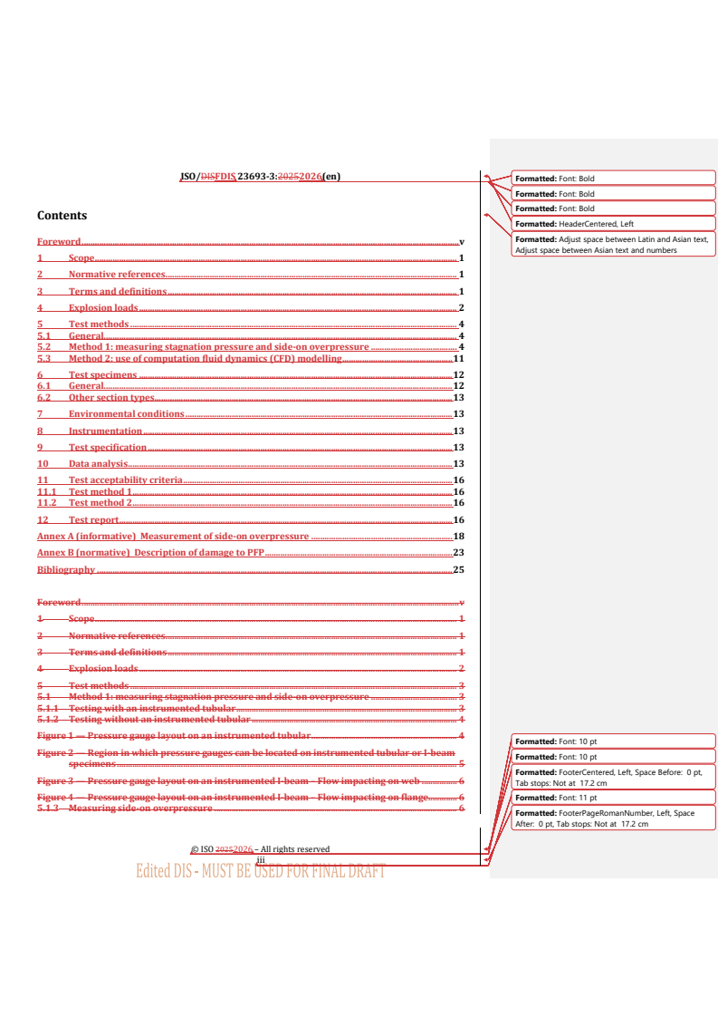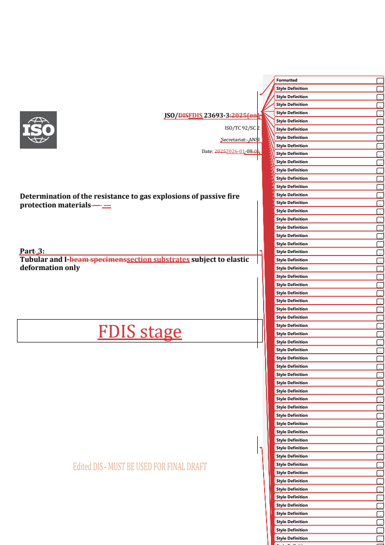 REDLINE ISO/FDIS 23693-3 - Determination of the resistance to gas explosions of passive fire protection materials — Part 3: Tubular and I-section substrates subject to elastic deformation only Released:9. 01. 2026