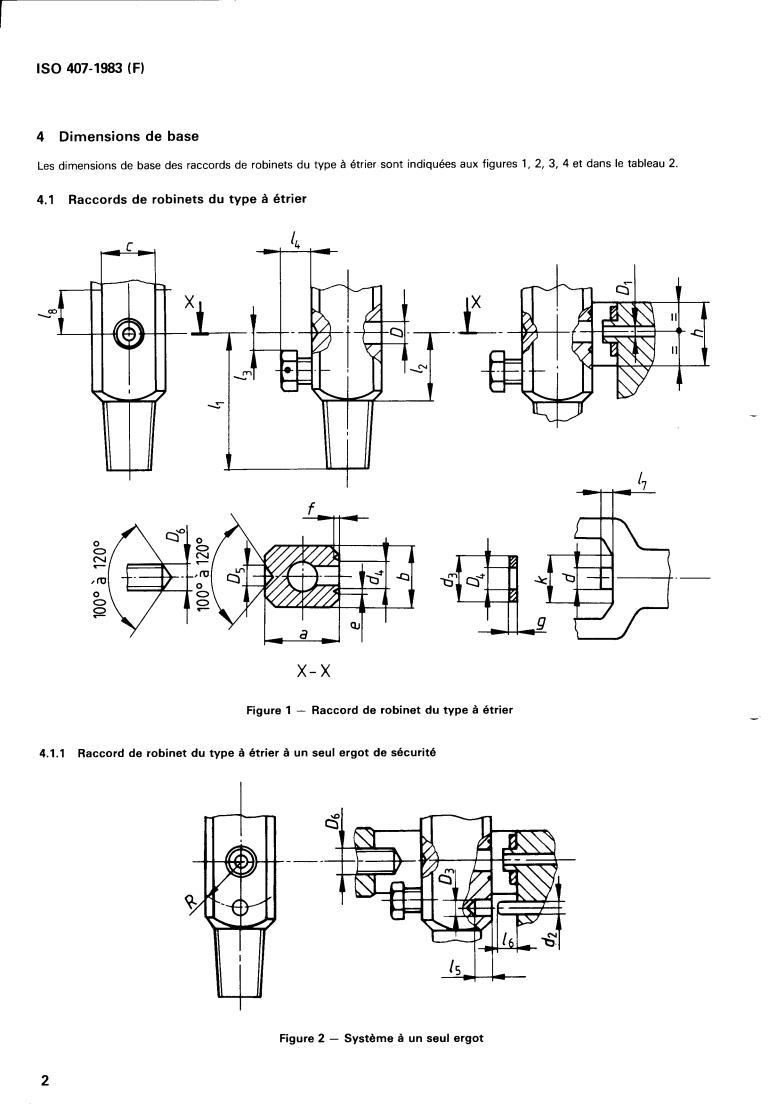 Les dimensions de base des raccords de robinets du type à étrier sont indiquées aux figures 1, 2, 3, 4 et dans le tableau 2.