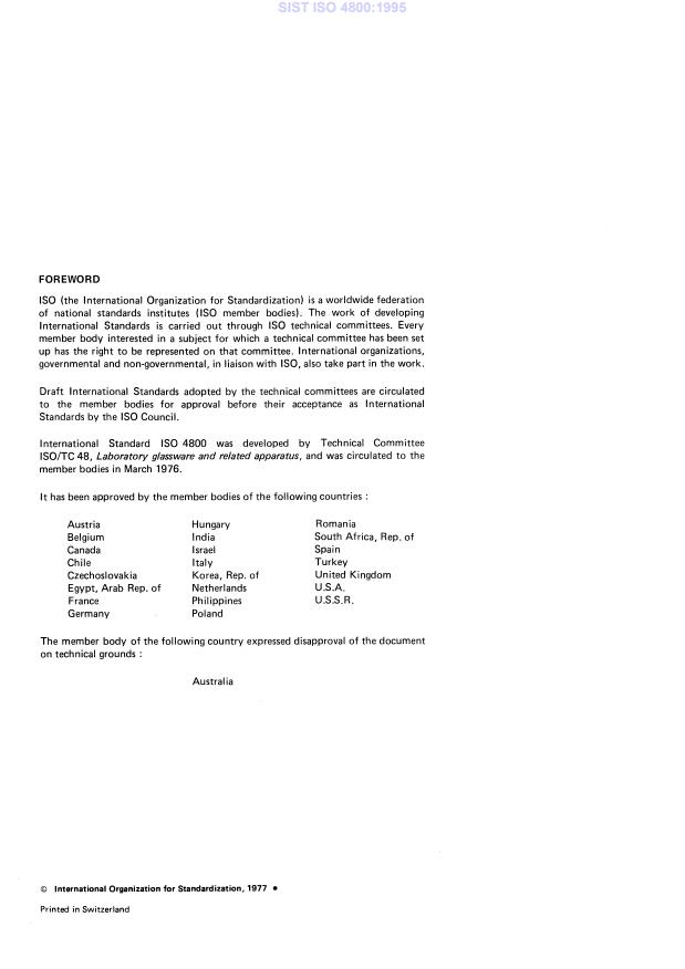 ISO 4800:1977 is a standard published by the International Organization for Standardization (ISO). Its full title is "Laboratory glassware — Separating funnels and dropping funnels". This standard covers: Laboratory glassware — Separating funnels and dropping funnels