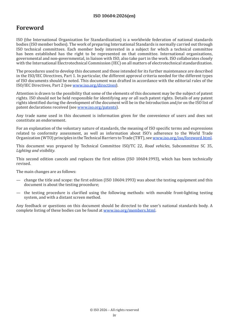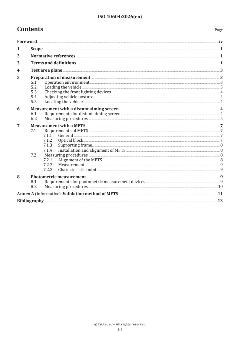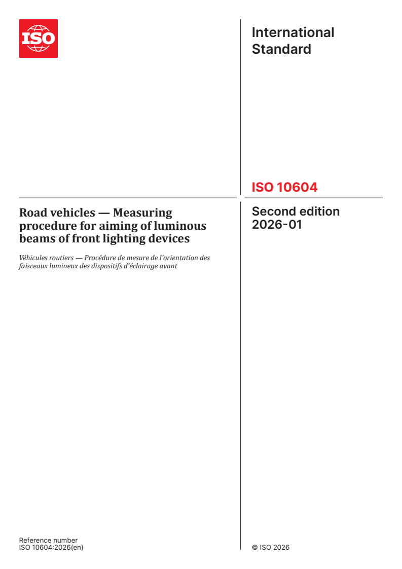 ISO 10604:2026 is a standard published by the International Organization for Standardization (ISO). Its full title is "Road vehicles — Measuring procedure for aiming of luminous beams of front lighting devices". This standard covers: This document specifies the procedure to measure or to verify the aiming of the luminous beams emitted by the front lighting devices installed on road motor vehicles excluding mopeds and motorcycles. This document prescribes the provisions specifying: a) the test conditions and test area plane; b) the preparation of the vehicle under test; c) the procedure using equipment with a distant aiming screen; d) the procedure using movable front-lighting testing system; e) the photometric measurement.