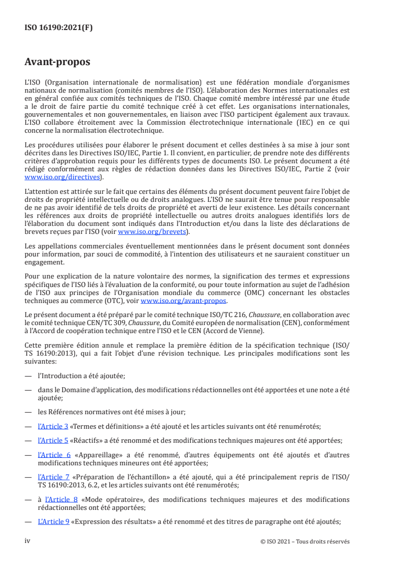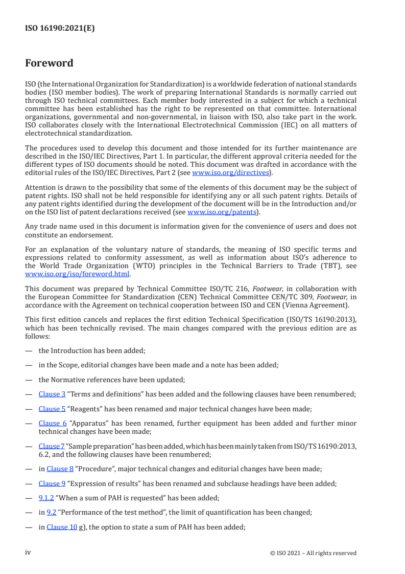 ISO 16190:2021 is a standard published by the International Organization for Standardization (ISO). Its full title is "Footwear - Critical substances potentially present in footwear and footwear components - Test method to quantitatively determine polycyclic aromatic hydrocarbons (PAHs) in footwear materials". This standard covers: This document specifies a method to determine the amounts of polycyclic aromatic hydrocarbons (PAHs) in footwear and footwear components. NOTE A list of relevant materials can be found in ISO/TR 16178:2021, Table 1[3].