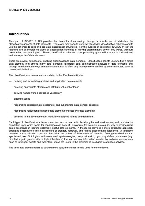 ISO/IEC 11179-2:2000 is a standard published by the International Organization for Standardization (ISO). Its full title is "Information technology — Specification and standardization of data elements — Part 2: Classification for data elements". This standard covers: Information technology — Specification and standardization of data elements — Part 2: Classification for data elements