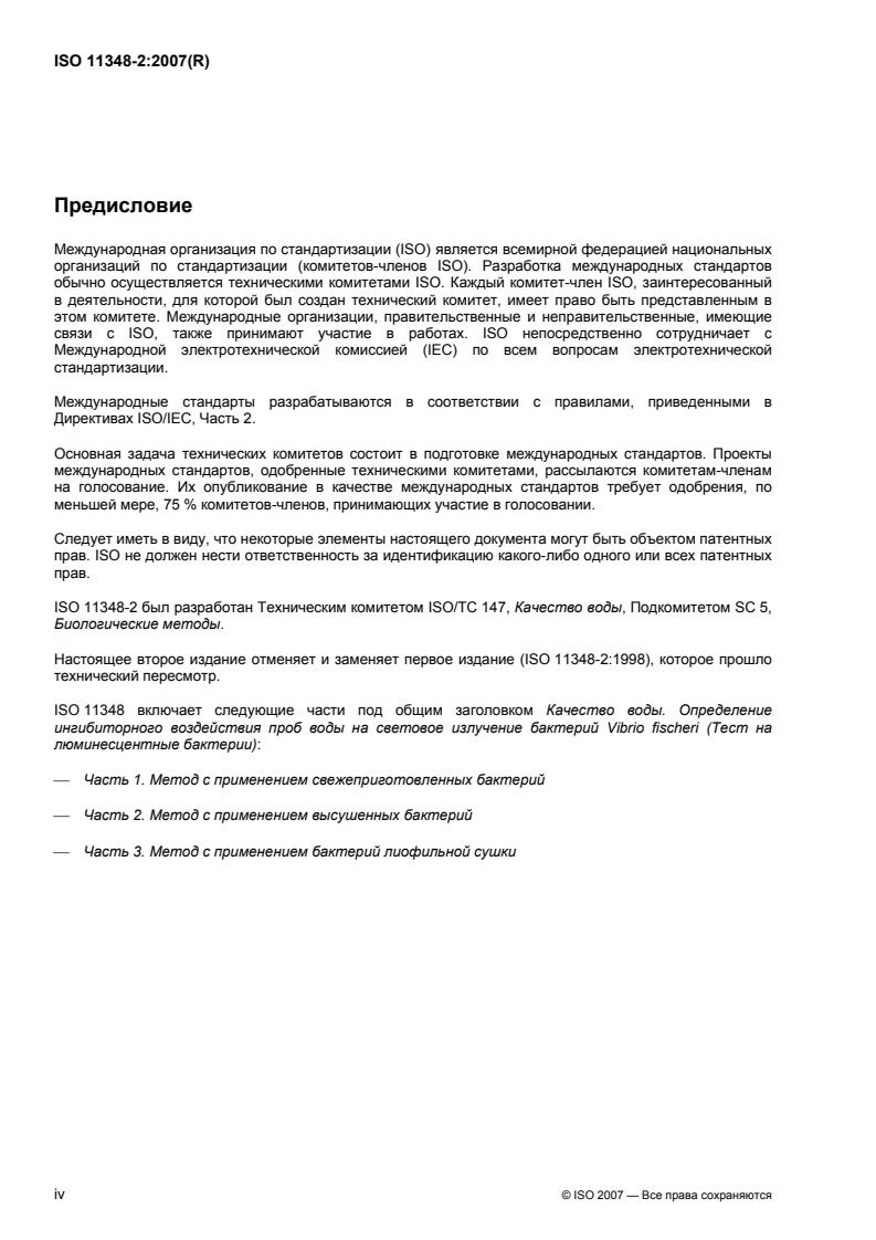 ISO 11348-2:2007 is a standard published by the International Organization for Standardization (ISO). Its full title is "Water quality - Determination of the inhibitory effect of water samples on the light emission of Vibrio fischeri (Luminescent bacteria test) - Part 2: Method using liquid-dried bacteria". This standard covers: ISO 11348 describes three methods for determining the inhibition of the luminescence emitted by the marine bacterium Vibrio fischeri (NRRL B‑11177). ISO 11348-2:2007 specifies a method using liquid‑dried bacteria. This method is applicable to: waste water; aqueous extracts and leachates; fresh water (surface water and ground water); sea water and brackish water; eluates of sediment (fresh water, brackish water and sea water); pore water; single substances, diluted in water.