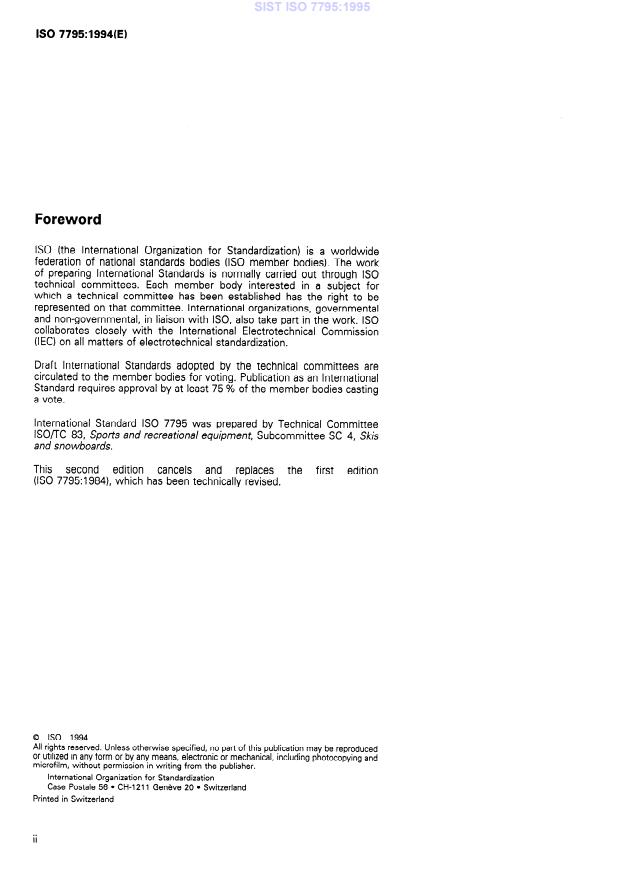 ISO 7795:1994 is a standard published by the International Organization for Standardization (ISO). Its full title is "Cross-country skis — Ski-binding screws — Test methods". This standard covers: Specifies test methods for the determination of the mounting and fastening characteristics of screws which are intended for fastening ski binding to cross-country skis. The results of these test methods characterize only the properties of the screw and give no information about the actual mounting and fastening characteristics of different ski models. Requirements are specified in ISO 7794.