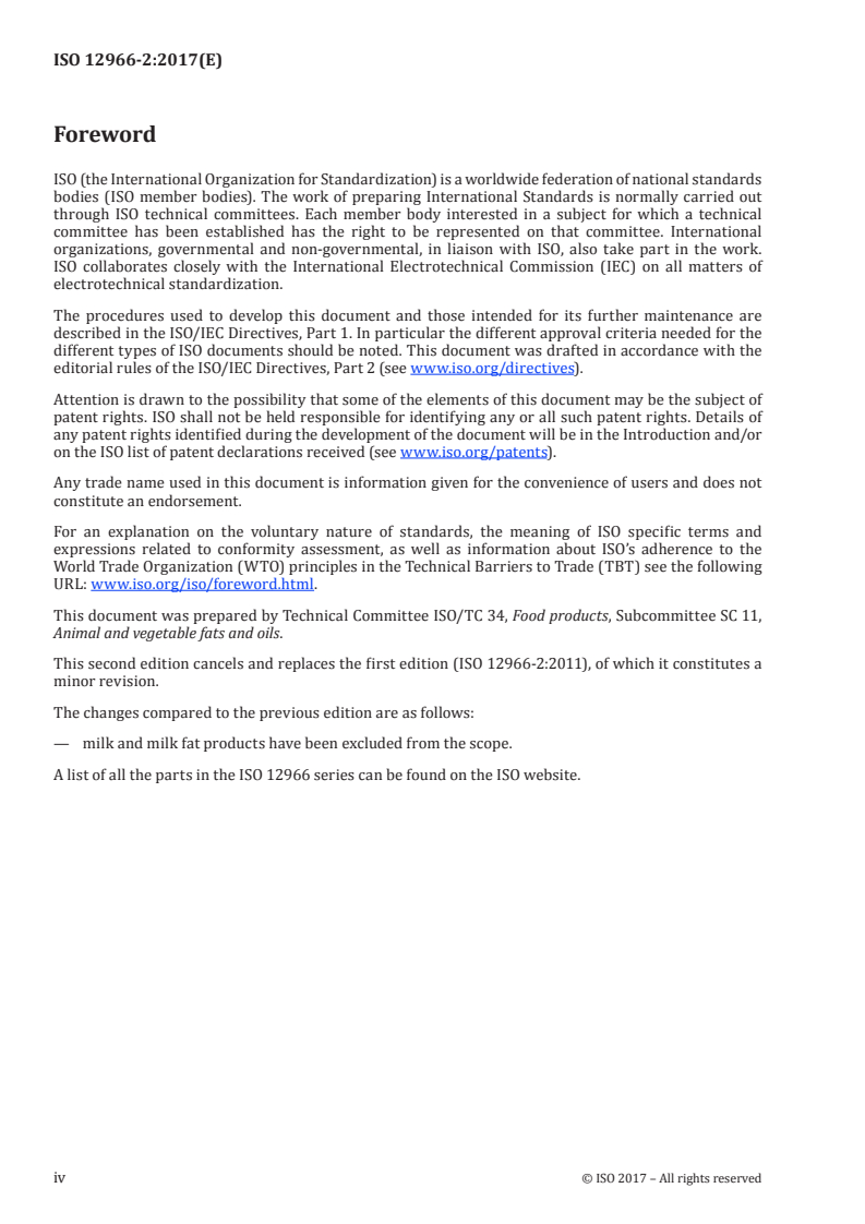 - Part of the ISO 12966 series (gas chromatography of fatty acid methyl esters). Other parts cover chromatographic conditions and identification; consult the ISO catalogue for related documents and cross-references.