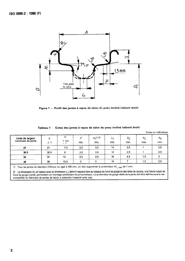 1) Pour les jantes de diamètre inférieur ou égal à 400 mm, on doit augmenter la profondeur HI, min de 1 mm.