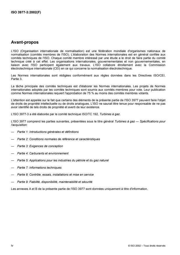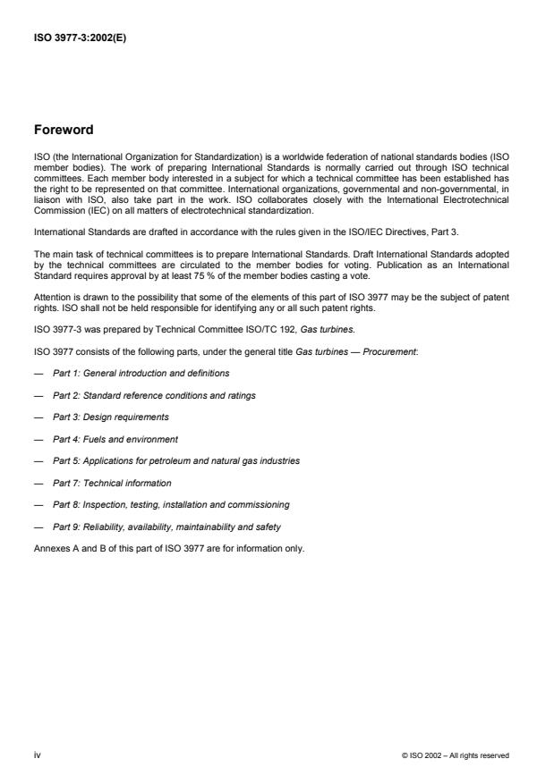 ISO 3977-3:2002 is a standard published by the International Organization for Standardization (ISO). Its full title is "Gas turbines — Procurement — Part 3: Design requirements". This standard covers: This part of ISO 3977 covers the design requirements for the procurement of all applications of gas turbines and gas turbine systems, including gas turbines for combined cycle systems and their auxiliaries, by a purchaser from a packager. It also provides assistance and technical information to be used in the procurement. It is not intended to deal with local or national legislative requirements with which the installation may be required to conform. This part of ISO 3977 is applicable to simple-cycle, combined-cycle and regenerative-cycle gas turbines working in open systems. It is not applicable to gas turbines used to propel aircraft, road construction and earth moving machines, agricultural and industrial types of tractors and road vehicles. In cases of gas turbines using special heat sources (for example, chemical process, nuclear reactors, furnace for a super-charged boiler), this part of ISO 3977 provides a basis.