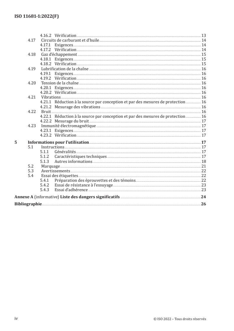 Le présent document spécifie les exigences de sécurité et les mesures pour leur vérification, pour la conception la construction, le transport et la mise en service des scies à chaîne portatives à moteur à combustion interne. Les scies à chaîne sont destinées à être utilisées pour les travaux forestiers par un seul opérateur, la main droite sur la poignée arrière et la main gauche sur la poignée avant. Le démontage et la mise au rebut du produit ne sont pas couverts par le présent document. Les méthodes d'élimination ou de réduction des risques découlant de l'utilisation de ces machines et le type d'informations sur les pratiques de travail sûres à fournir par le fabricant sont spécifiés. Le présent document traite de tous les dangers significatifs, situations dangereuses ou événements dangereux pertinents pour ces machines, à l'exception du rebond et de l'équilibre pour les machines de cylindrée supérieure à 80 cm3, lorsqu'elles sont utilisées normalement et dans des conditions de mauvais usage raisonnablement prévisibles par le fabricant (voir Annexe A). Le présent document s’applique aux scies à chaîne fabriquées après sa date de publication.