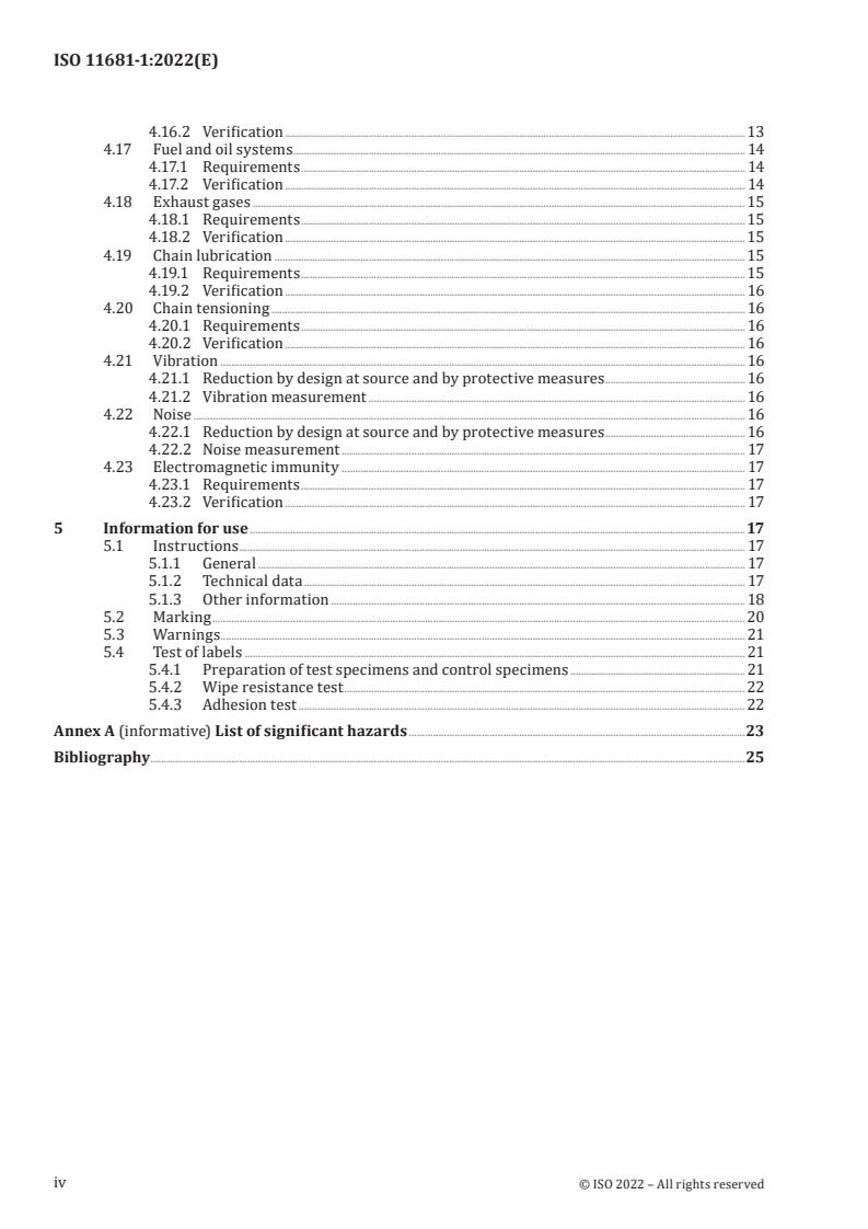 ISO 11681-1:2022 is a standard published by the International Organization for Standardization (ISO). Its full title is "Machinery for forestry - Portable chain-saw safety requirements and testing - Part 1: Chain-saws for forest service". This standard covers: This document specifies safety requirements and measures for verification for the design, construction, transporting and commissioning of portable, combustion-engine, hand-held chain-saws. The chain-saws are intended to be used for forest work by only one operator, with the right hand on the rear handle and left hand on the front handle. Dismantling and scrapping of the product is not covered by this document. Methods for the elimination or reduction of hazards arising from the use of these machines and the type of information on safe working practices to be provided by the manufacturer are specified. This document deals with all significant hazards, hazardous situations and hazardous events, with the exception of kickback and balance for machines with an engine displacement of more than 80 cm3, relevant to these machines when they are used as intended and under conditions of misuse which are reasonably foreseeable by the manufacturer (see Annex A). This document is applicable to chain-saws manufactured after its date of publication.