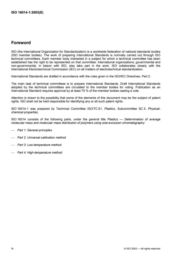 ISO 16014-1:2003 is a standard published by the International Organization for Standardization (ISO). Its full title is "Plastics — Determination of average molecular mass and molecular mass distribution of polymers using size-exclusion chromatography — Part 1: General principles". This standard covers: ISO 16014-1:2003 specifies a general method for determining the average molecular mass and the molecular mass distribution of polymers using size-exclusion chromatography (SEC). The average molecular mass and the molecular mass distribution are calculated from a calibration curve constructed using polymer standards. Therefore this method is classified as a relative method.