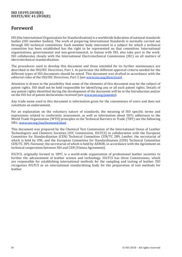 ISO 10195:2018 is a standard published by the International Organization for Standardization (ISO). Its full title is "Leather — Chemical determination of chromium(VI) content in leather — Thermal pre-ageing of leather and determination of hexavalent chromium". This standard covers: This document specifies a thermal pre-ageing procedure for leather to obtain indications about the tendency to the formation of hexavalent chromium under specified conditions and the determination of hexavalent chromium according to ISO 17075‑1 or ISO 17075‑2. This thermal pre-ageing procedure does not simulate any real condition in leather production or use. It is applicable to all types of chromium tanned leather.