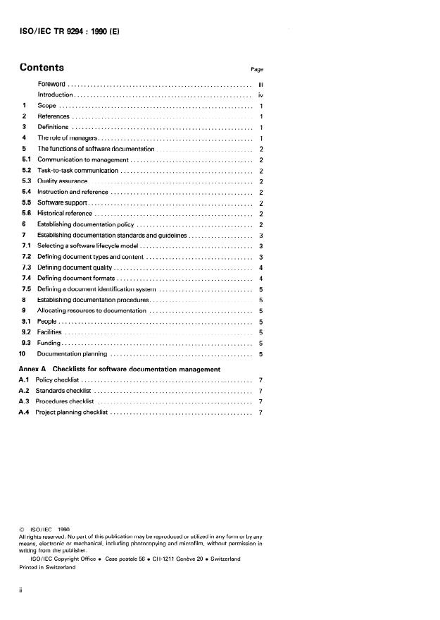 ISO/IEC TR 9294:1990 is a technical report published by the International Organization for Standardization (ISO). Its full title is "Information technology — Guidelines for the management of software documentation". This standard covers: Addresses the policies, standards, procedures, resources and plans to produce an effective software. Applicable to all types of software from the simplest program to the most complex software system and to all stages of the software lifecycle. Detailed advice on the content and layout of software documentation is not provided. Annex A contains checklists of the policies, standards, procedures and project planing on the software production.